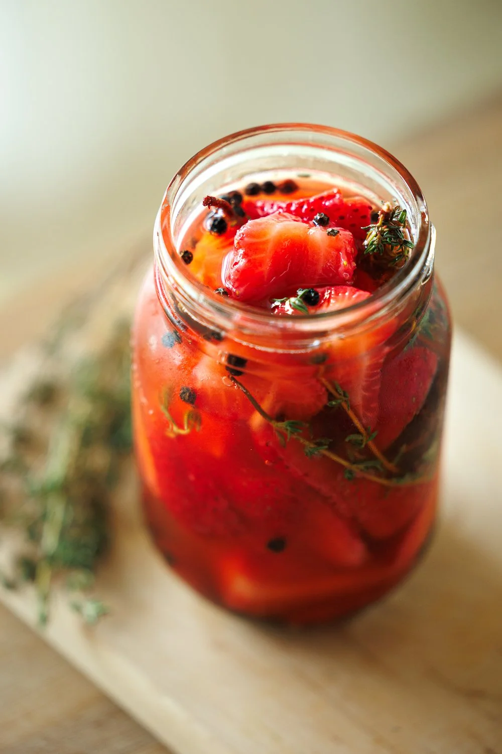 Dans un pot en verre hermétique (500 ml), ajouter le poivre, le bâton de cannelle, l’anis étoilé et le thym. Ajouter les fraises, verser le liquide contenu dans le bol réservé à l’étape précédente. Fermer le pot et secouer légèrement.