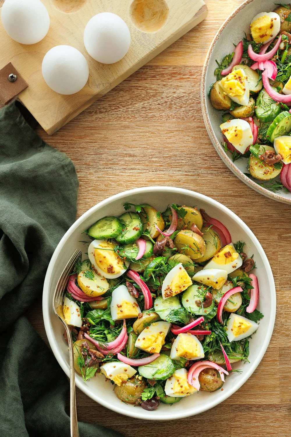 Dans un grand bol, ajouter les pommes de terre, les concombres, les olives, le persil et l’aneth. Verser la vinaigrette et mélanger délicatement. Répartir le contenu du grand bol dans deux assiettes. Répartir les œufs et les oignons marinés.